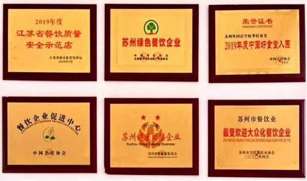 荣获多项荣誉和认证,如“食品安全示范单位”“全国绿色餐饮企业”“苏州健康团膳企业”“最受欢迎大众化餐饮企业”“餐饮行业示范单位”等,彰显企业实力。